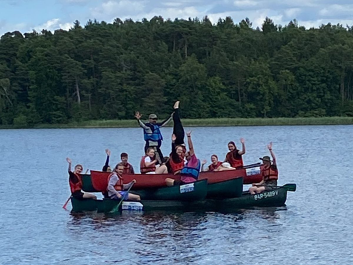 Am Donnerstag stand nun die große Überprüfung an, auf die wir uns durch tägliche Übungseinheiten gut vorbereitet hatten. Wir wurden in vier Kategorien überprüft: Technik, Parcours, Zeitrennen gegeneinander und Kentern. Mit der Überprüfung endete unser „Kanu-Abenteuer“ und zum Abschluss bildeten wir mit allen vorhandenen Kanus eine Pyramide auf dem Wasser für ein gelungenes Abschlussfoto. Danach wurden die Kanus abgeholt und wir haben uns auch auf unsere Abreise vorbereitet.