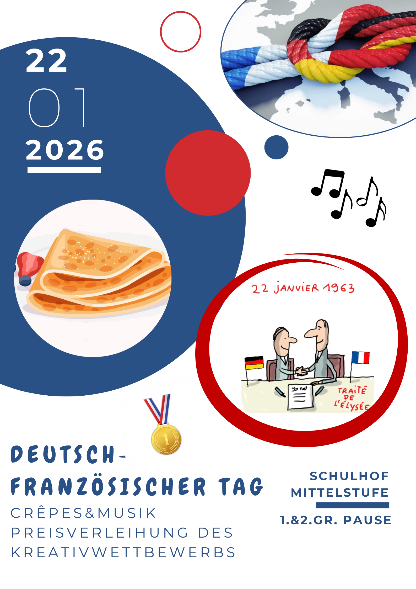 Am 22. Januar 2026 wurde an unserer Schule erneut der Deutsch-Französische Tag gefeiert – ein besonderer Tag, der an die Unterzeichnung des Élysée-Vertrags im Jahr 1963 erinnert. Dieser Vertrag legte den Grundstein für die enge Zusammenarbeit und Freundschaft zwischen Deutschland und Frankreich und steht bis heute für Versöhnung, Austausch und gemeinsame europäische Werte.