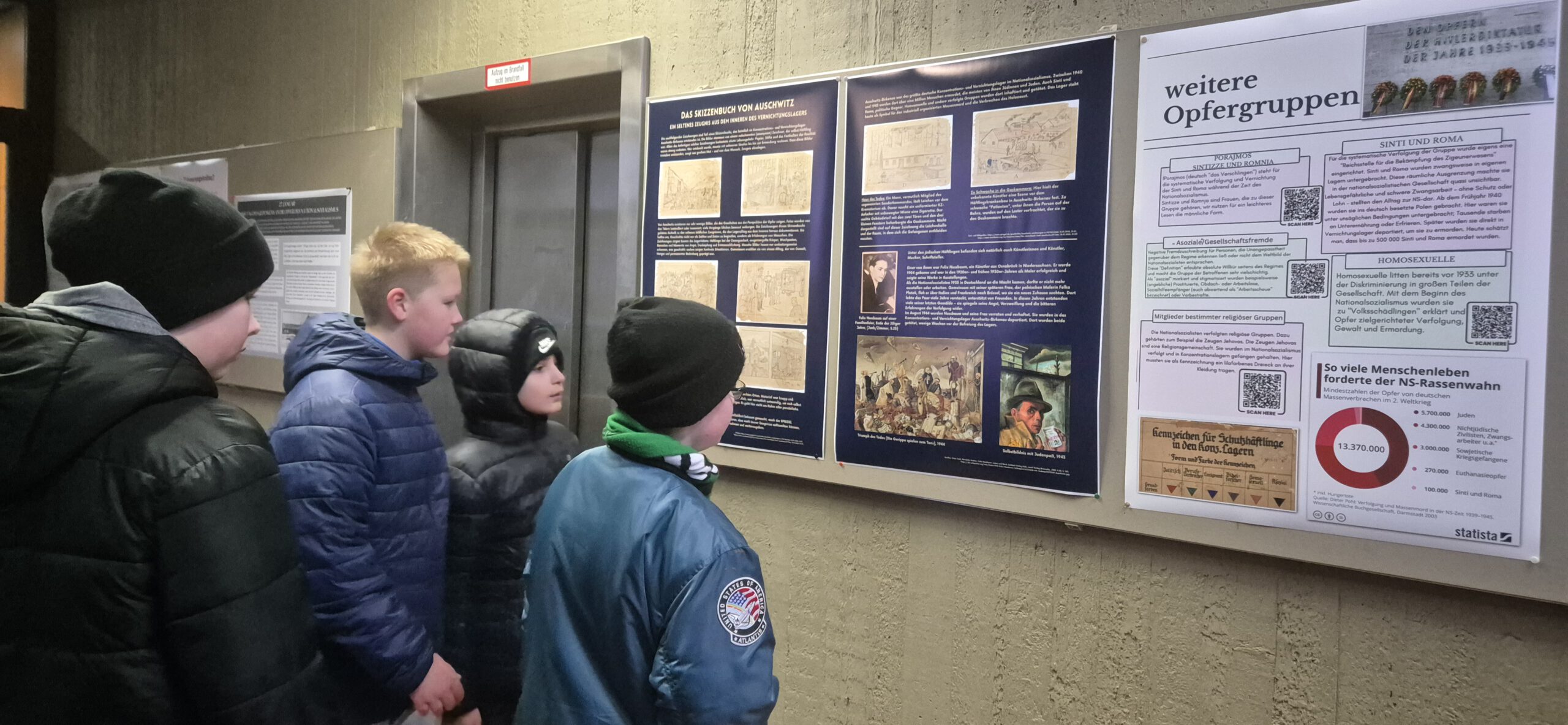 Ziel war es, die Bedeutung der Erinnerungskultur für die Gegenwart hervorzuheben und die Schulgemeinschaft für die historische Verantwortung zu sensibilisieren. Im Mittelpunkt der Aktion stand die Gestaltung und Präsentation von thematisch ausgerichteten Postern, die von den Lehrkräften vorbereitet und im Flur des Oberstufengebäudes ausgehängt wurden. Die Poster behandelten zentrale Aspekte des Holocaust, darunter die systematische Verfolgung und Ermordung der europäischen Juden, die Schicksale einzelner Opfer bzw. Zeitzeugenberichte wie das „Skizzenbuch von Auschwitz“. Ergänzt wurden diese Inhalte durch Zitate, historische Fotografien und kurze Erläuterungstexte, die eine niedrigschwellige Auseinandersetzung ermöglichten.