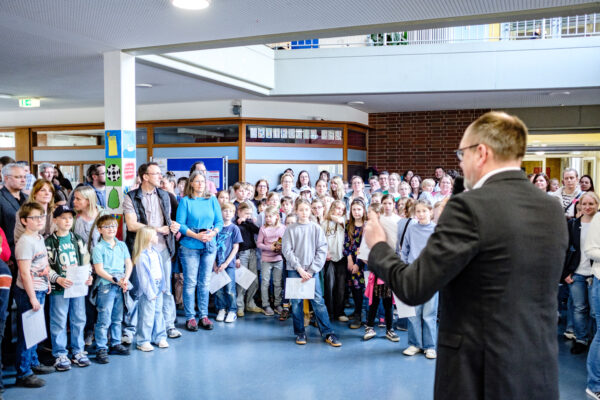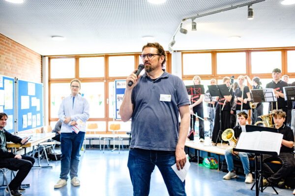 Der Tag der offenen Tür begann mit einer Begrüßung durch die Schulleitung, Frau Brandes und Herrn Perk, außerdem durch einführende Worte von Herrn Schachschal für die Unterstufenleitung und Herrn Pfeiffer als Organisator der Veranstaltung. Der Anfang wurde schwungvoll musikalisch umrahmt durch die Bläserklasse 8e unter Frau Holmer. Danach gab es die Möglichkeit, durch Mitmachaktionen spannende Einblicke in den Fachunterricht am Gymnasium zu gewinnen und dabei fleißig Stempel auf dem Laufzettel zu sammeln, um dann ein begehrtes Freigetränk in der Mensa zu erhalten. Daneben konnten sich die Viertklässler*innen und ihre Eltern auch über weitere besondere Angebote, wie z.B. die “Digitalen Helden”, unser Patenkonzept für die fünften Klassen, Erasmus, den Sanitätsdienst, AG-Angebote wie Theater – oder Bienen-AG, die Arbeit des Fördervereins und vieles mehr informieren.